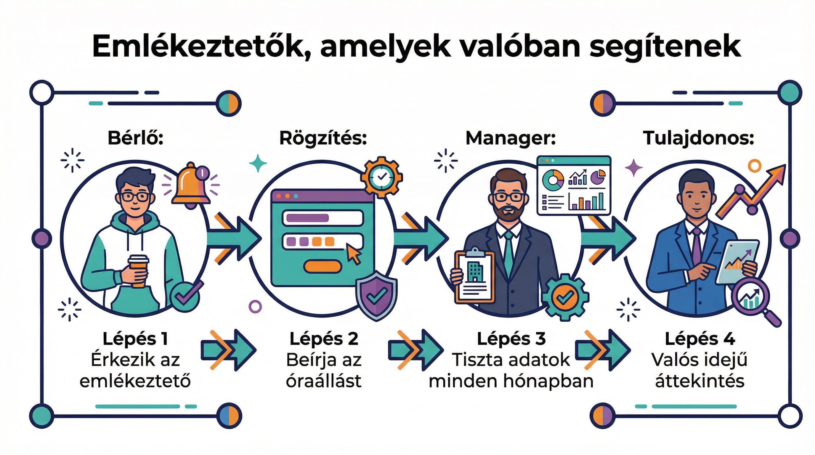 A bérlőnek egy jelzés, hogy rögzíteni kell. A managernek kevesebb utánajárás. A tulajdonosnak garantáltan friss adatok minden hónapban.