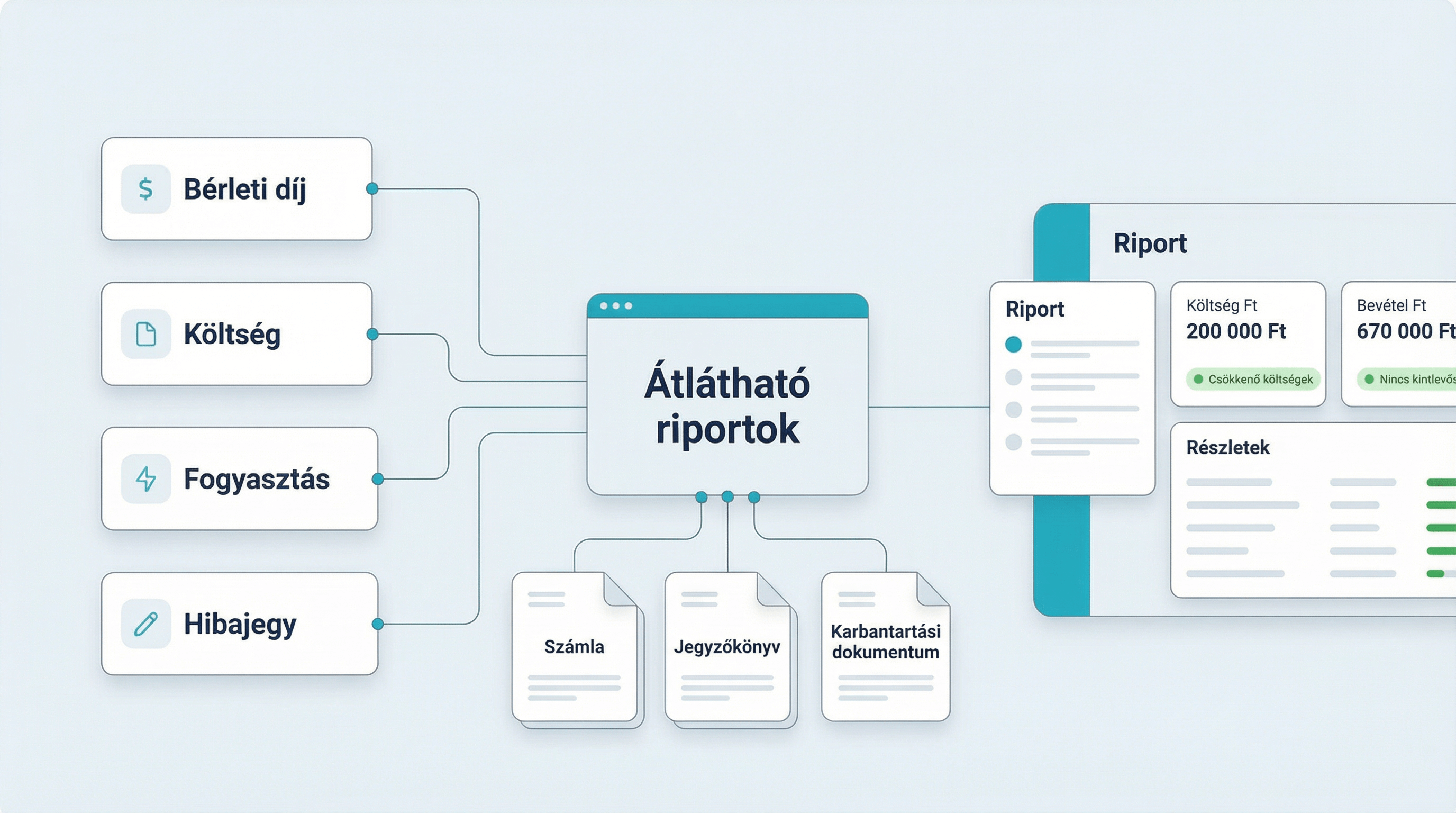 A rendszer alapelve, hogy a riport nem könyvelési dokumentum, hanem értelmezhető visszajelzés a működésről. Nem adathalmazokat mutat, hanem válaszokat ad olyan kérdésekre, amelyek ténylegesen felmerülnek az üzemeltetés során.